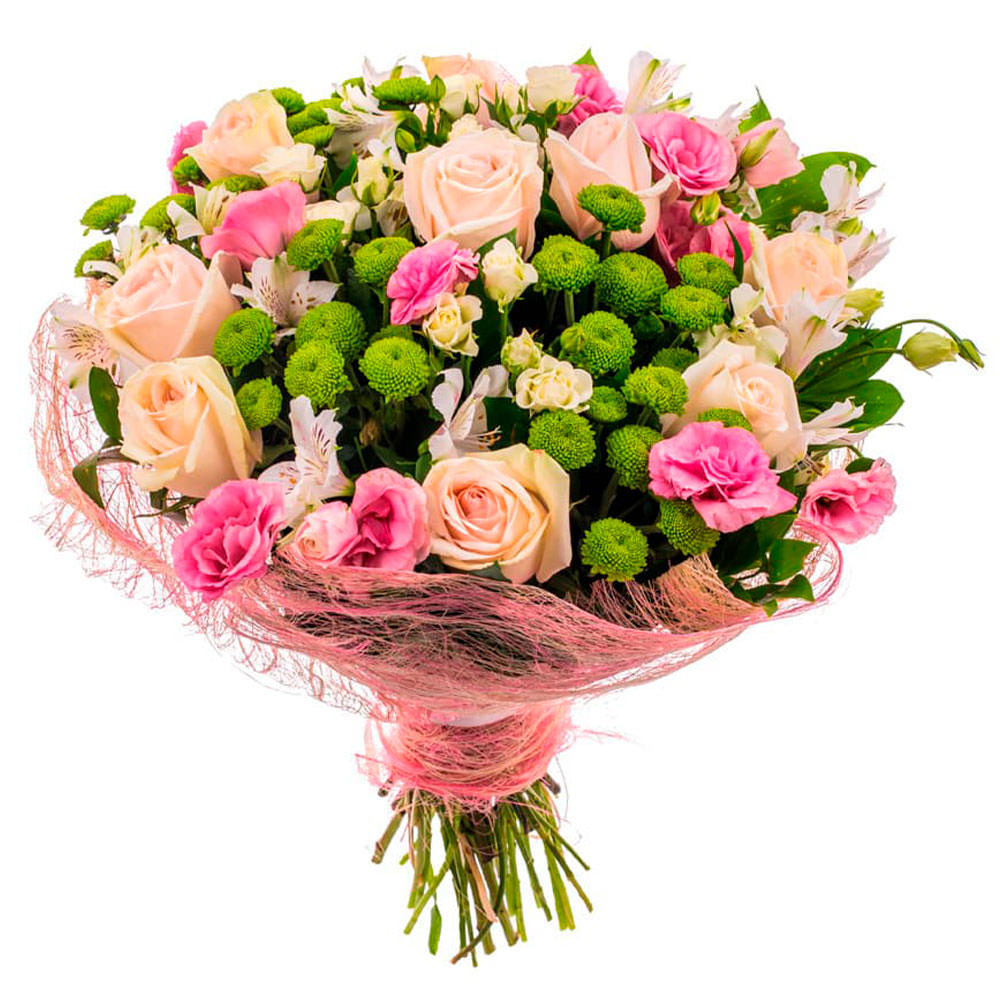 Роза одноголовая кремовая, роза кустовая кремовая, хризантема кустовая зеленая, альстромерия нежно-розовая, эустома розовая. Упаковка (лента, пленка, крафт, сетка, пленка матовая)